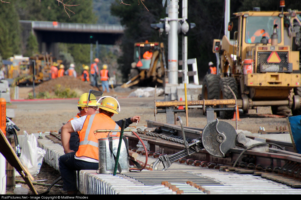 Workers take a mid-day break while replacing track at the crossing in downtown Colfax.