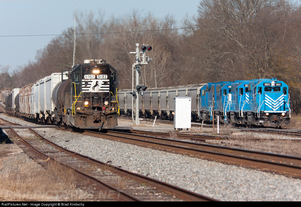 L&C Job 14 has completed their brake test and is ready to depart, meanwhile NS train P36 pulls into town. Five GP38-2s, including a high hood...