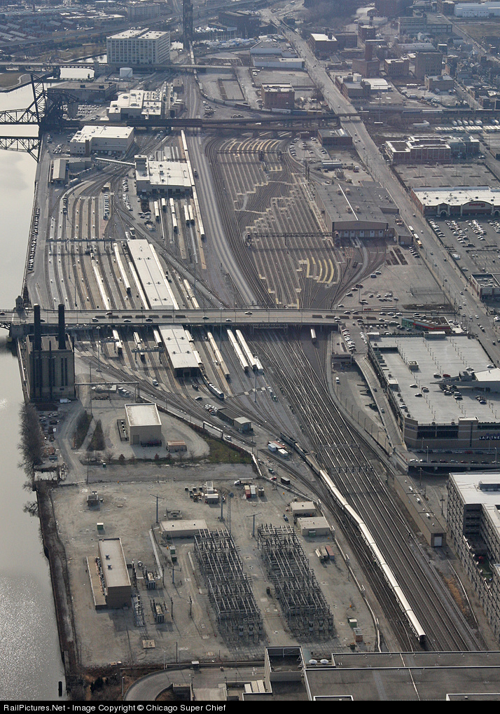 A bird's eye view of the Amtrak Chicago Yard (left) and Metra Coachyard (right). The 1/8/12 edition of the California Zephyr backs into Union Station prior to its departure, while the Southwest Chief sits in the ready yard, to back in to Union Station shortly after.