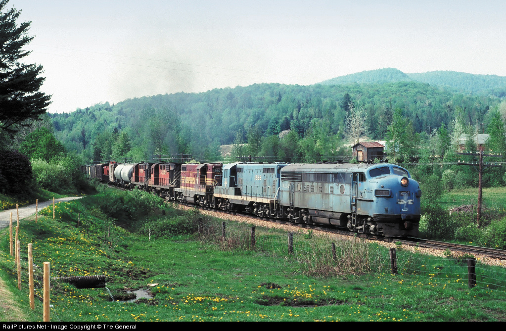 Newport, Vermont to East Deerfield, Massachussets train, is working uphill, southbound on Candian Pacific rails. As B&M's last operating cab unit, lack of nose MU, and other issues, made the 4266 a familiar sight as the trailing unit on mid 1970's Connecticut River line trains. On this southbound run out of Newport, Vermont things were different. CP provided helpers over the hill to St. Johnsbury, Vt. Because the helpers took the form of trailing units, B&M 4266 was forced to take the lead on this sunny Sunday. In a matter of weeks, however, expensive problems would take her out of service. Instead of being scrapped, B&M 4266 was restored to factory paint to serve on the Conway Scenic RR. in New Hampshire.