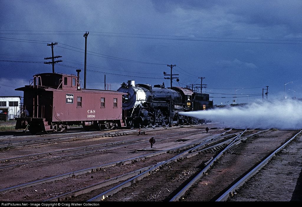 In a scene from August 1958, Colorado & Southern O-4 class 2-8-2 809 (built in 1919 for parent Chicago Burlington & Quincy), shunts C&S caboose 10596 around the yard in Denver, Colorado. (Frank "Woody" Woodburn photo, Craig Walker collection)