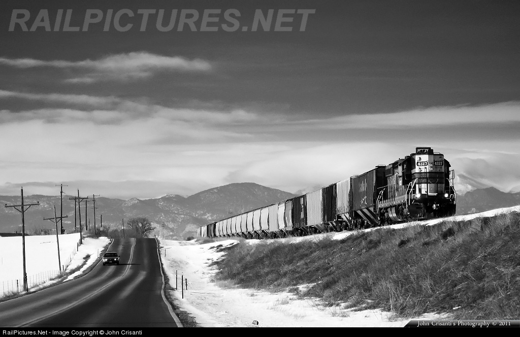 | Lets Race The Train A car rolls along side the GW1 local as the car coasts down hill. Here, GW1 is making their trip East out of Loveland to Kelim and Johnstown at a place called Birds. |