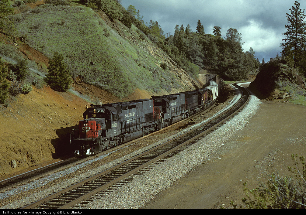 Due to maintenance on track 1, SP 8355 West is running on track 2 which usually carries only eastbounds. The head end has just exited Tunnel 23. At this spot, trains normally run on the "left-hand" track. Just east of this location is the flyover at Applegate where one track crosses over the other.