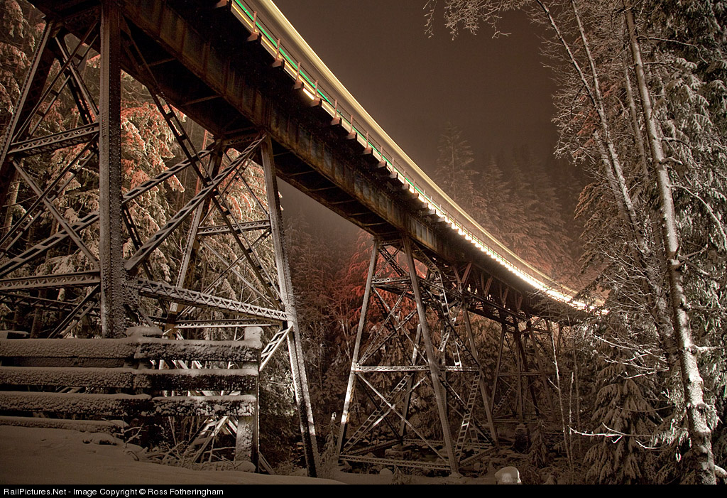 Foss River Bridge; Amtrak number 8 lights up the snowy valley as it makes it way east up the 2.2% grade on Stevens Pass. Taken during the annual Tracks in the Snow Event with fellow RPix contributors Joel Hawthorn and Robert Scott. Inspired by Steve Carter and Diamond Dave Honan.