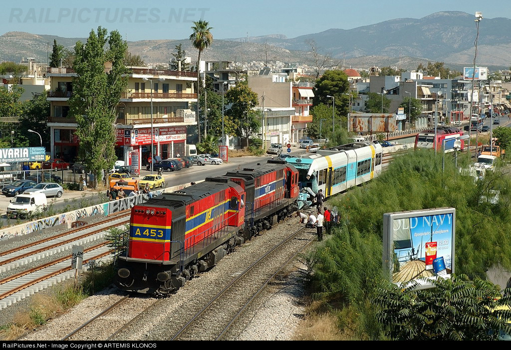 Head-on collision at Treis Gefyres area, a few kilometers after Athens central station in direction to the north. The suburban train 4003 operated with the Railbus 560 103/203 and the local freight train 80100 headed by the MLW A504, meet its other on the same line. Due to low speed there was no one died and 56 passengers has had lightly injured. The MLW A 453 is a rescue loco.