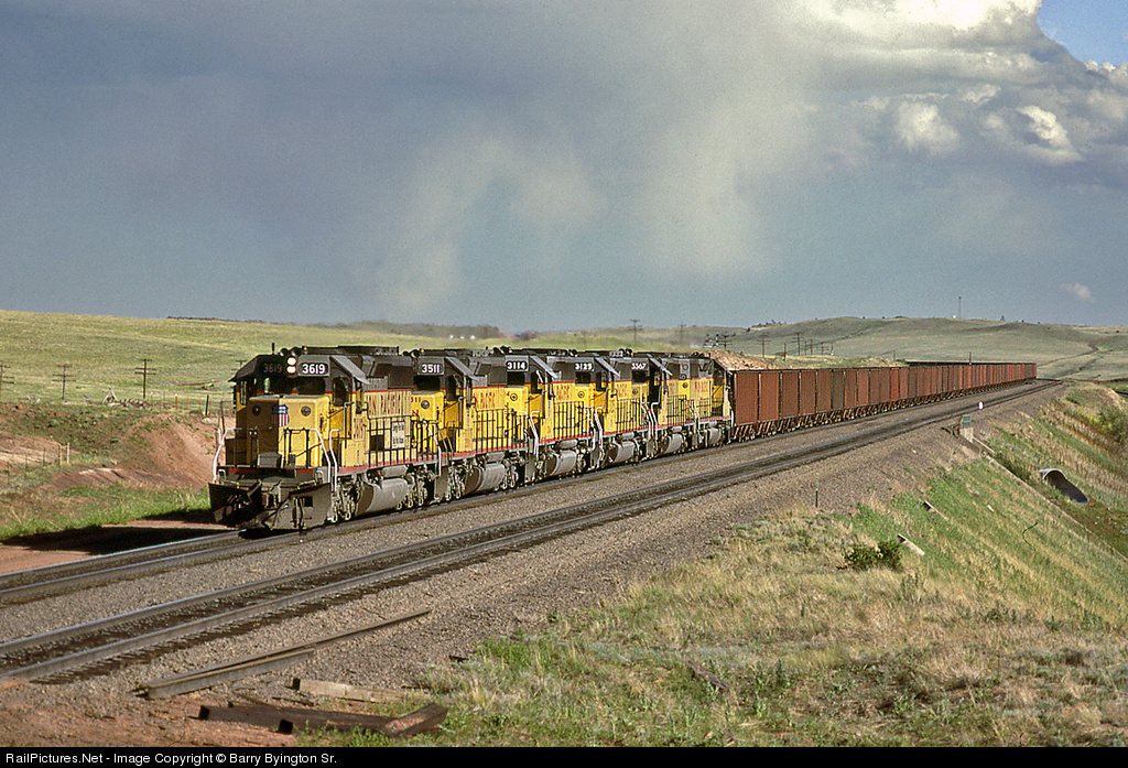 Diehard photographers of the OLD UP will recognize this seldom seen side of Sherman Hill, the west slope so-to-speak. Late afternoons in the summer presented somewhat of a degree of difficulty getting sunlit trains, as the thermals out of the valley really blossomed. Get some sun though, and the upslope winds of the plains east of Cheyenne often brought towering cumulo-nimbus to add depth to the shot. Here an empty coal train drops down the "easy" grade towards Colores and Laramie on track 1. Just above the last unit and behind can be seen the west signal bridge of Hermosa, CP545. Barely visible on the right is the Red Buttes line, dropping off the table downgrade to Laramie on track B3, the preferred westbound route off the hill. Two eastbounds on track 2 are about to meet the 3619, while the last of the afternoon fleet of shooters glide by on B3, dynamics whining.