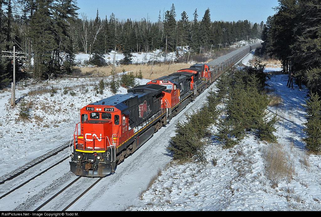 | If two are good then three would be better. A trio of somewhat new to the CN C40-8's bringing with them a whole lot of horsepower to lead a 120 car train of taconite rock south to the plant on a cold day in northern Minnesota. Usually this job has only the two dash 8's but maybe due to the cold weather, shop forces upgraded the power assignments. |