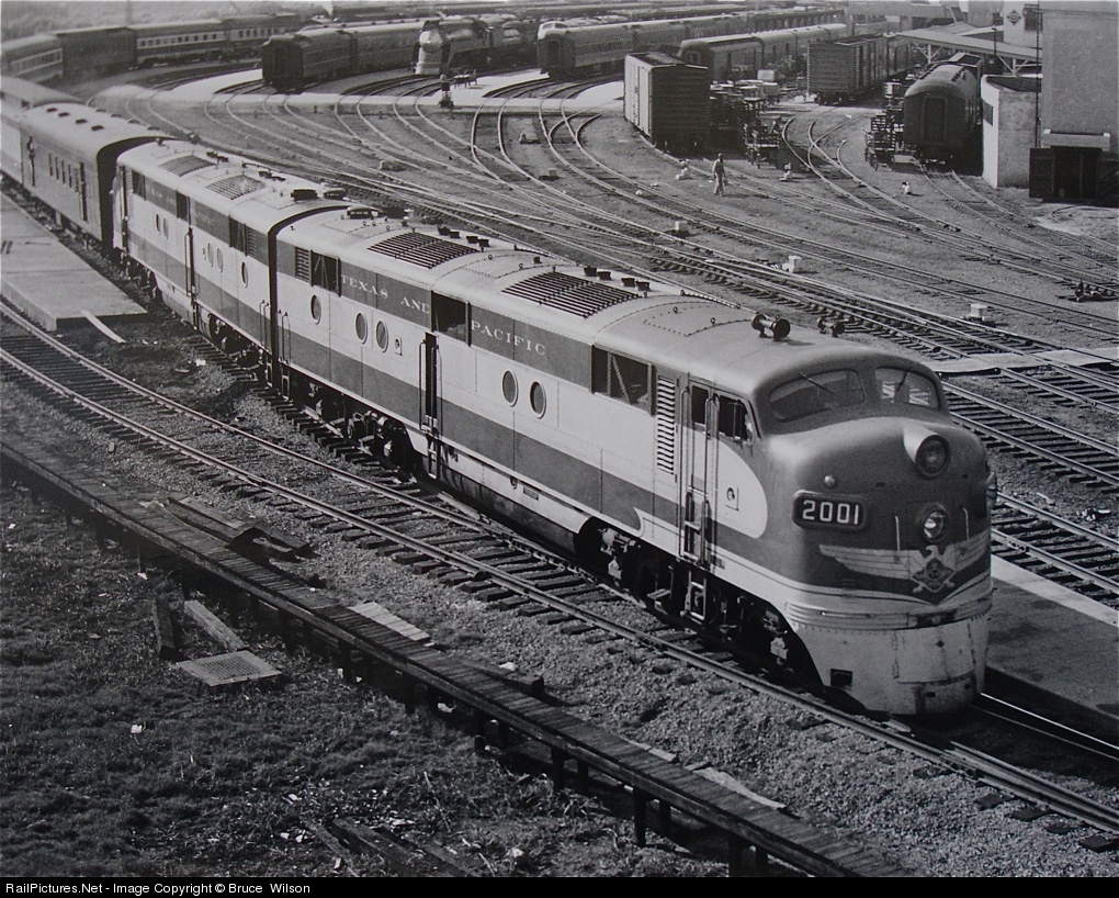 leaves on its way to St. Louis. The train will later be known as the Texas Eagle when it receives its streamlined consist. In the background are the Southern Pacific Sunbeam and the Burlington Sam Houston Zephyr.