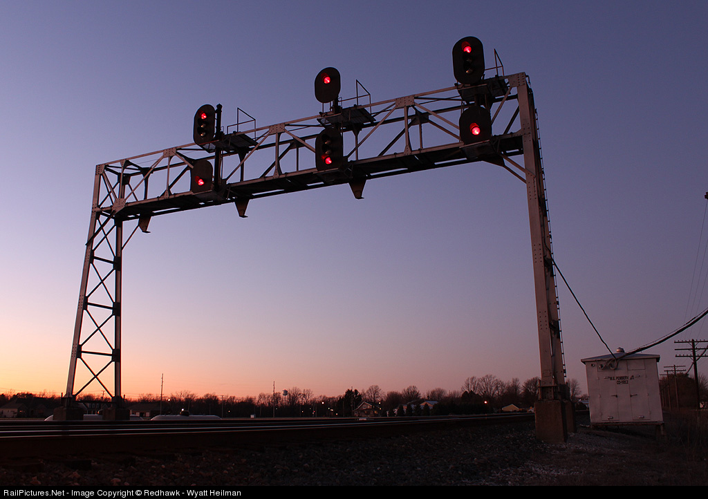 | Dusk settles over Pemberville as the hulking three-track signal bridge stands guard at the W.E. of Pemberville center siding. Before too long, darkness will fall and the dispatcher will line a westbound up... |