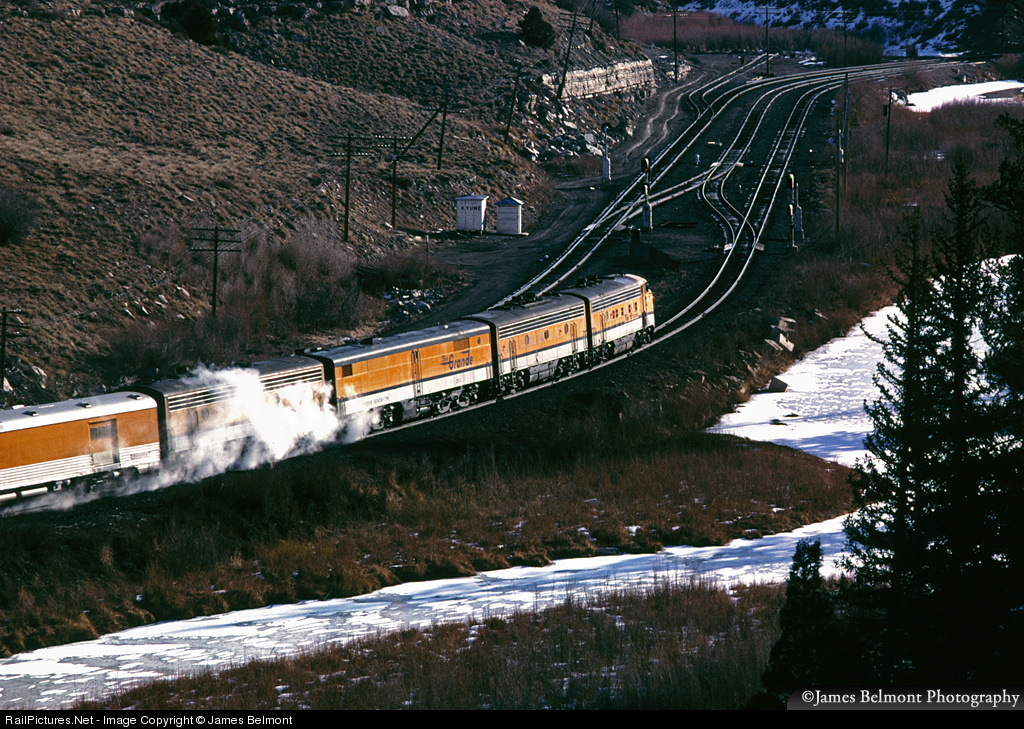 If you've ever wanted proof that the Rio Grande Zephyr was heated by steam, here's your evidence. At West Kyune, train #18 begins the 14 mile, 2.3% descent to its regular station stop Helper, Utah. Note the meandering course of the frozen Price River.