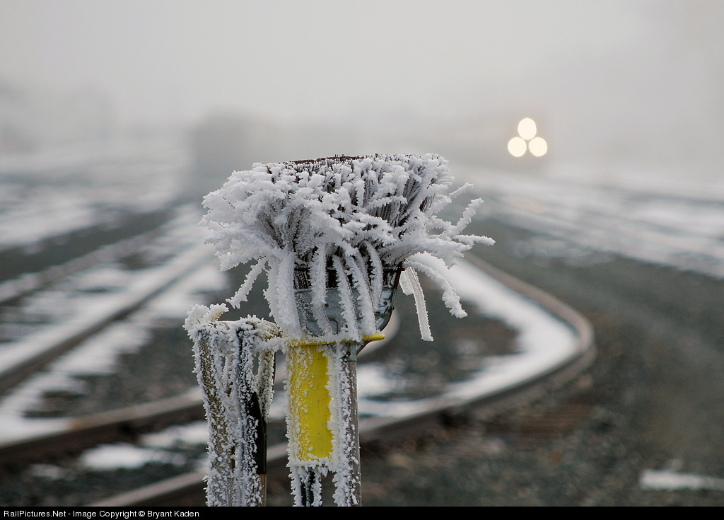 With several days of fog, virtually no wind, and below freezing temperatures, the frost is as thick as I've ever seen it, evidenced by this broom and shovels at the west end of Glenwood Yard. They continue to await their next use as a westbound train gets underway after a crew change.
