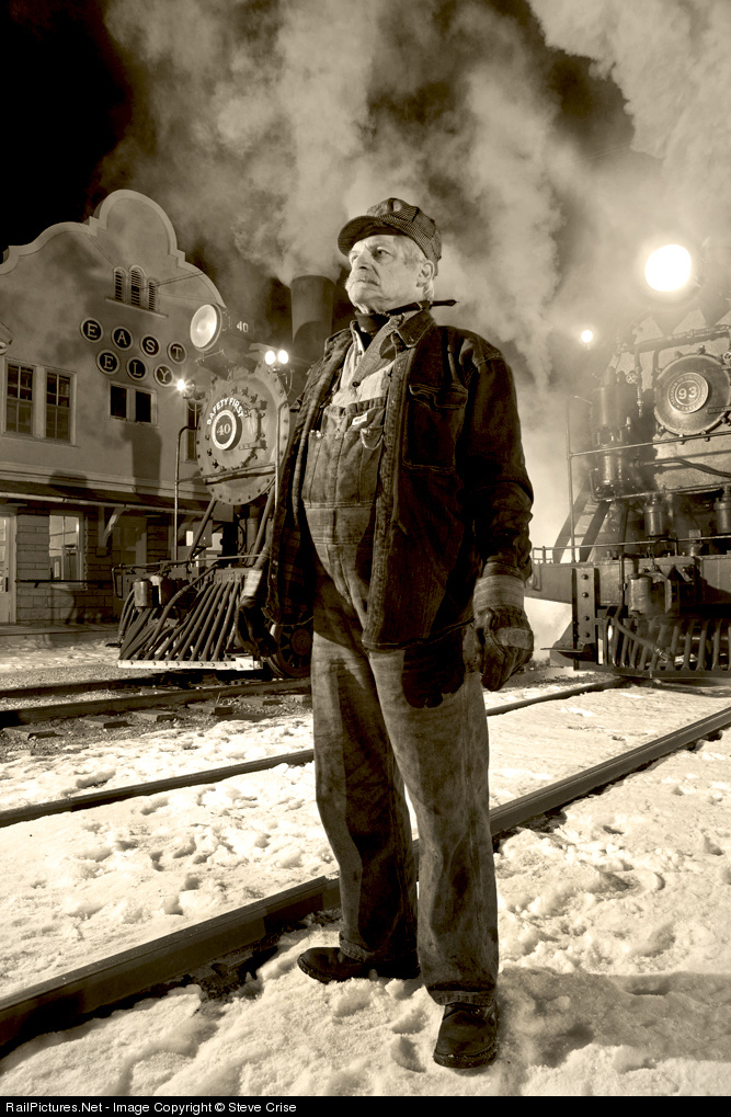 | Engineer Tyson with locomotives standing by – East Ely depot, February 3rd, 2012, Ely Nevada. For more details on the Winter Photo Shoots at the Nevada Northern Railway, plus many more events held year round at railroad, please visit www.nnry.com. Steve Crise Photo – © 2012 |