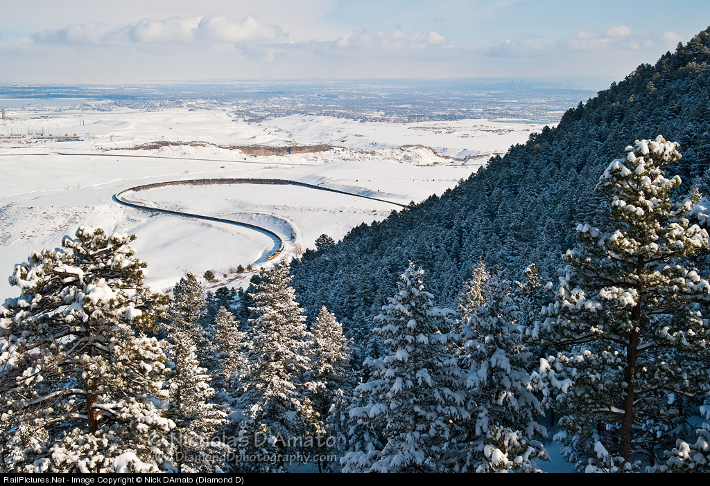 | Denver had its largest February snowfall ever recorded between February 2nd and 4th 2012. After 48 hours of wind-whipped snow, the clouds finally broke around lunchtime on the 4th to reveal a glorious landscape of snow-covered trees and soft cool light. A quick trip up to Big 10 Curve resulted in this capture of an eastbound loaded coal (and snow) drag descending toward Rocky siding. |