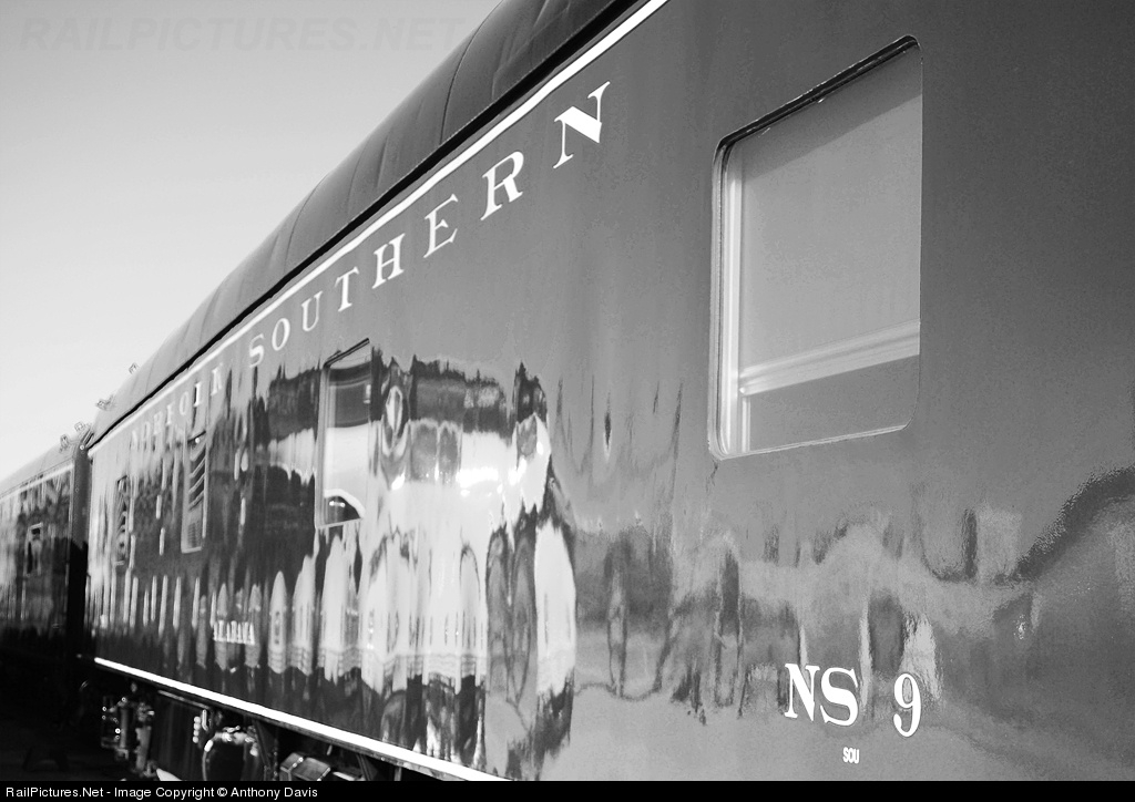 | Who Needs A Mirror? NS 4271 checks itself out in the reflection of Norfolk Southern's OCS Car #9 the 'Alabama'. The train stays sqeeky clean during its week stay for the Master's Golf Tournament with constant baths whenever needed to maintain this look. |