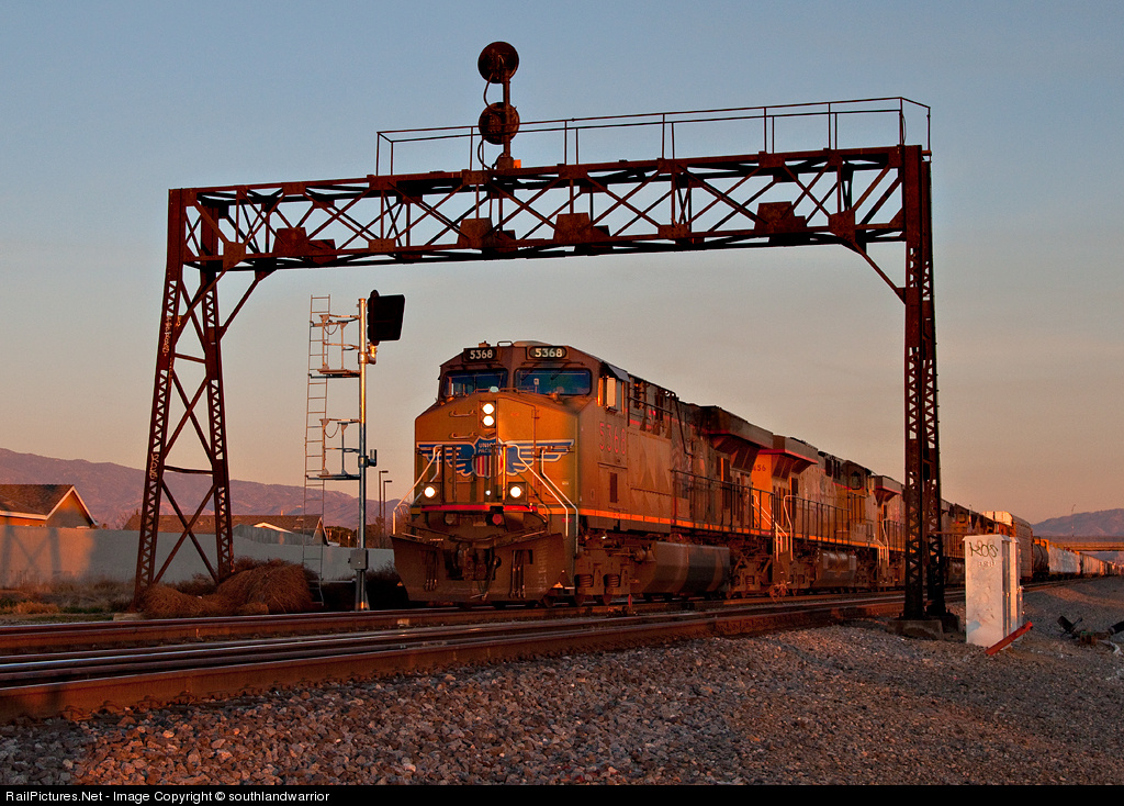 | The sun sets in California's San Joaquin Valley as a UP manifest rolls under the signal bridge at Quantico just north of downtown Bakersfield. A replacement color light has already been installed, and it's now only a matter of time until the venerable structure falls into history. |