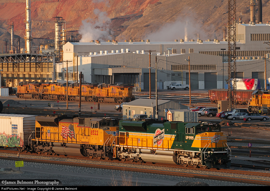 | With the Chicago & North Western Heritage SD70ACe in the lead, Union Pacific's MNPWC prepares to depart North Yard in Salt Lake City. Visible in this perspective from the 6th North bridge are the former Union Pacific Salt Lake Shops (built to service gas turbine-electric locomotives), now a UTA facility and the Tesoro oil refinery looming in the background on the northeast side of the yard. |