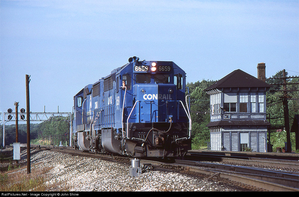 A pair of ex Erie Lackawanna SD45-2's with their large fuel tanks are passing MO tower as they return to Cresson after pushing a train over the Horseshoe Curve line.