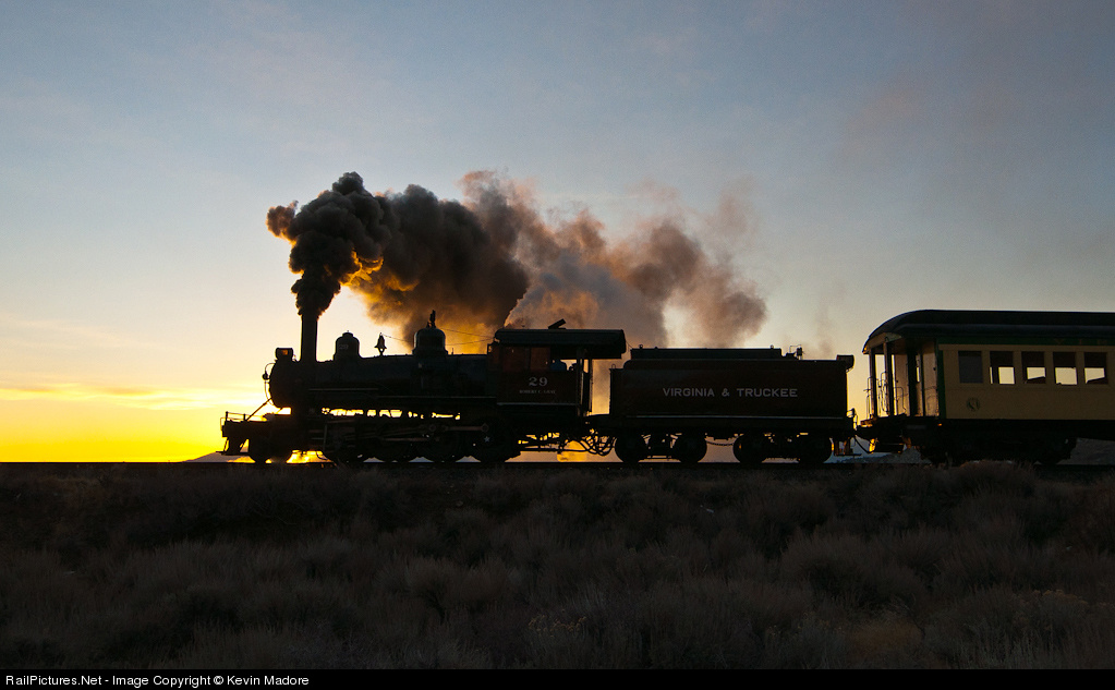 Silver City Dawn. In the sandy hills above the mining town of Silver City, the Virginia & Truckee's Consolidation #29 chugs slowly up the grade toward Gold Hill at sunrise. Although not native to the line, Locomotive 29 definitely shares the profile of the last of the original V&T Engines. The 29 was acquired from a line in Oregon by the new V&T back in the 1970s, when owner Robert Gray rebuilt the section of track from Virginia City to Gold Hill. She was numbered VT 29, continuing the sequence of numbers from the orginal V&T, which stopped at 27. And yes, before you ask, the former Dardanelle & Russellville #8 served the rebuilt line briefly in the 70s before the 29 arrived and was numbered VT 28 at the time. A Lerro Productions Photo Charter.