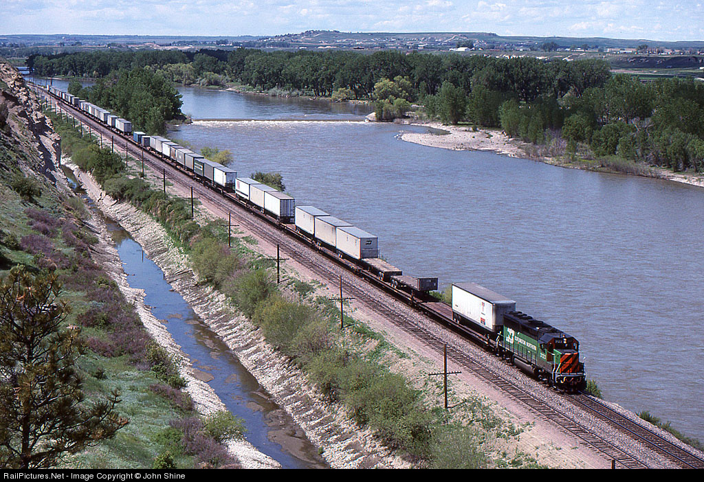 Burlington Northern GP50 3123 in the "Tiger Stripe" scheme single handidly heads Eastbound Intermodal train #21 along the Yellowstone River East of Billings.