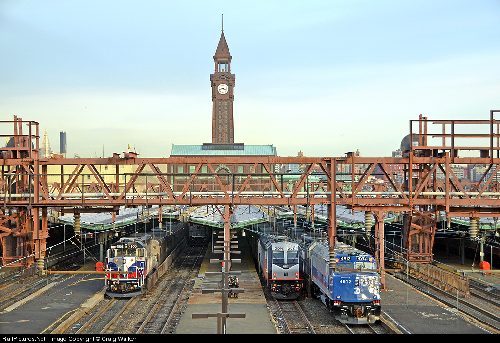 | At 3:41 PM, the rush hour at NJ Transit's Hoboken Terminal has not yet gotten into full swing. But trains are lined up waiting to begin their task of ferrying weary workers home this evening. From left to right are Metro-North GP40PH-2 4906, NJ Transit PL42AC 4023 and Metro-North F40PH-3C 4912. |