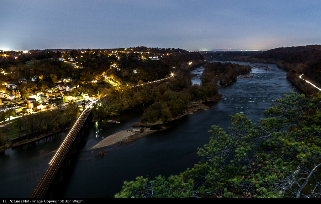 Looking down on Harpers Ferry, WV and the Potomac River from Maryland Heights. Eastbound Q226 autorack train has just called the "Peachers Mill" signal just out of sight midframe and glides along the river as it did last at Cherry Run. It rushes past Harpers Ferry and begins to dart across the bridge and begins to blow its horn before entering Harpers Ferry Tunnel ahead. The 300 second exposure stops before that can happen, leaving the train in limbo and creating this scene under a near full moon.