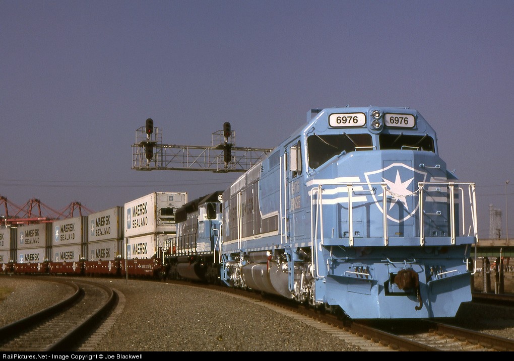 BNSF's exAmtrak exSanta Fe (Santa Fe called them SDF40-2's) SDP40F 6976 specially painted for MAERSK by BNSF for use at the grand opening of MAERSKs new pier 400 facility on Terminal Island at the port of Los Angeles was leading a special (unofficial) publicity train expecially for the MAERSK photographer stopped at CP Badger