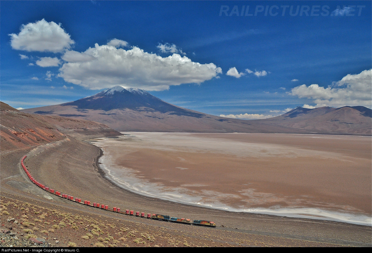 In a magnificent place, the Salar de Carcote located right in the Andes at 4000 meters above sea level, this train FCAB rail company that transports zinc concentrate, and is completing his long journey, coming to town next of Ollague.