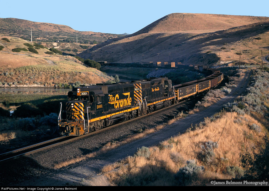 A pair of classic Rio Grande GP30s emerge from the shadowy Jordan Narrows into the bright morning sun at Mesa, Utah. The UT04L would make its first stop at Geneva Steel before turning at Provo Yard. A special thanks to Mr. Doug Jolley, a D&RGW employee at the Roper diesel shop who took the time to hand wash the venerable 3001, helping the Grande Gold paint shine through!