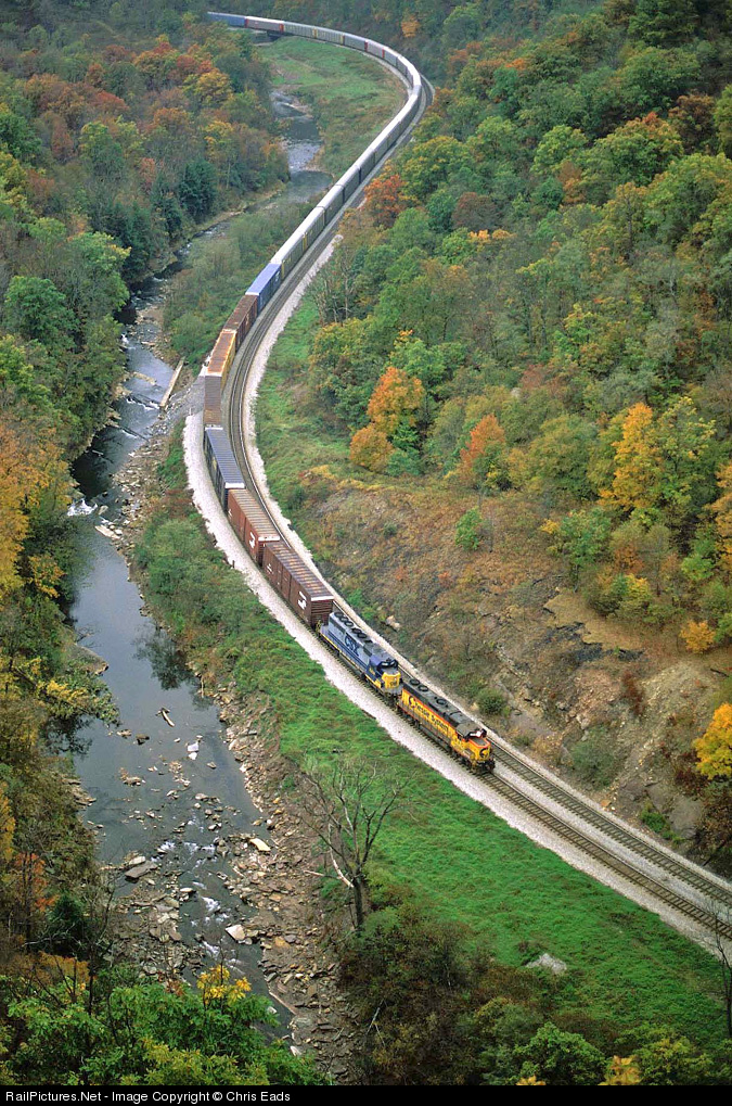 Fairhope, PA, October, 1998 - A former B&O GP-38 in Chessie System colors leads a former Seaboard System SD-40-2 downhill along the winding Wills Creek, deep in the mountains along CSX's Sand Patch grade. Just head of the eastbound train is Falls Cut Tunnel, a brick-faced tunnel that dates back to 1897. The train is Q-286, hauling auto parts and automobiles to port.