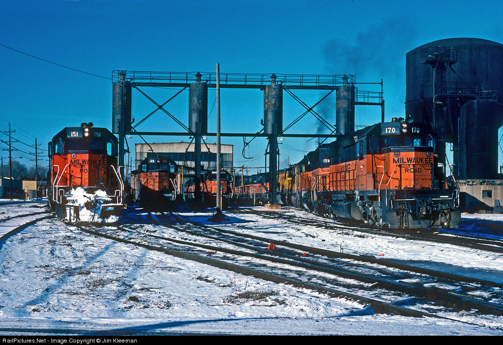 In 1982 the struggling Milwaukee Road still displayed an impressive collection of motive power at their Bensenville engine terminal on the northwest side of Chicago. In three years the bankrupt railroad would be taken over by the Soo Line. Today CP red adorns most of the locomotives in this yard. Sic transit