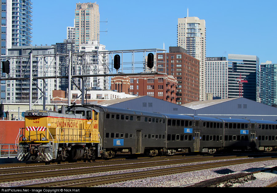 UPY 1488 shoves a train of Metra bilevels through the city, headed for Ogilvie Transportation Center.