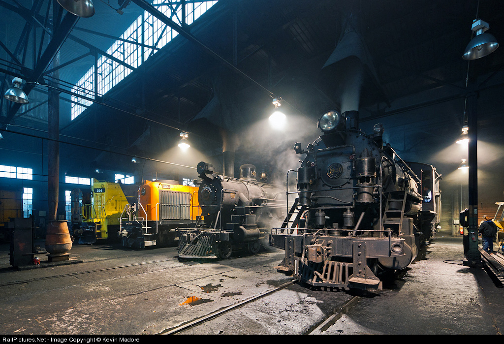 Wake up and smell the coal smoke! Coming through the door from the Machine Shop to the Engine House, this is the scene that greets visiting photographers from around the world each morning, during the annual February Photo Shoots at the Nevada Northern Railway. Lined up before you, the museum's four active locomotives are being made ready for the day's activities. The sense are immediately overtaken with the constant din of blower hiss, the smell of oil and coal smoke, and the sight of steam clouds wafting around the machinery. Immediately in front of the camera, Alco Consolidation #93 will shortly be assigned a hopper train. A freight train of wooden box cars awaits the high-stepping 10-wheeler #40. Beyond it, the orange Alco RS-3 #109 will be handling the yard switching duties today. In the distance, the blue and yellow SD9 #204, which is normally the workhorse of the museum fleet, will get to sit this one out, unless one of her sisters has a problem. She's the standby power for today.