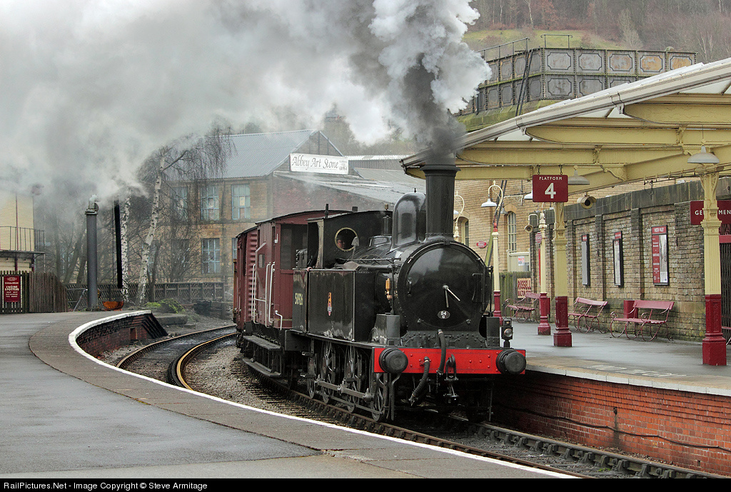 | It is quite a rare event to see any locomotive heading a freight train into the beautifully restored station at Keighley because Locomotives are normally facing the other way. It's even rarer not to get the usual throng of enthusiasts or tourists on the platform! The 1888-built L&NWR 'Coal Tank' looks a treat in its glistening BR livery as she powers through with a recreated pick-up freight |