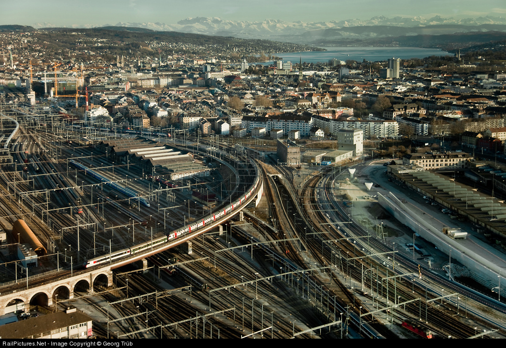 | On an mild early spring day with a good view to the alps and Lake of Zurich, Inter Regio 2356 from Lucerne to Zurich Airport is leaving Zurich main station over the curved bridge towards Oerlikon. View from the Bar Bistro "Clouds" on the 126 meter high "Prime Tower" building. |
