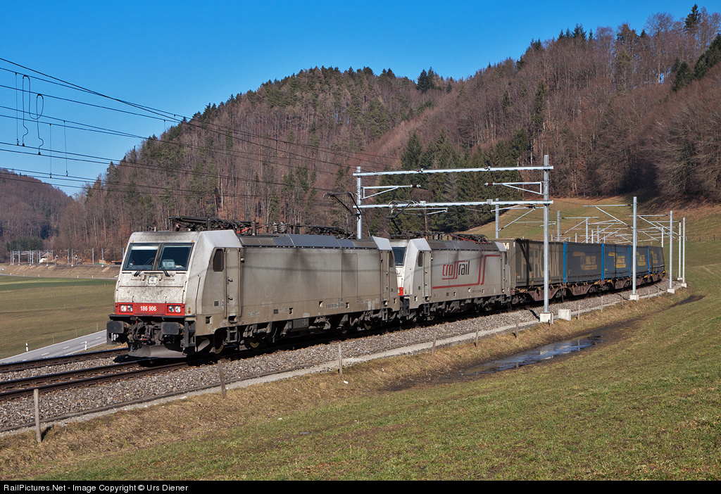 | Crossrail 186 906 and 186 902, both a little bit dirty, pulling the LKW-Walter intermodal train from Germany to Italy. |