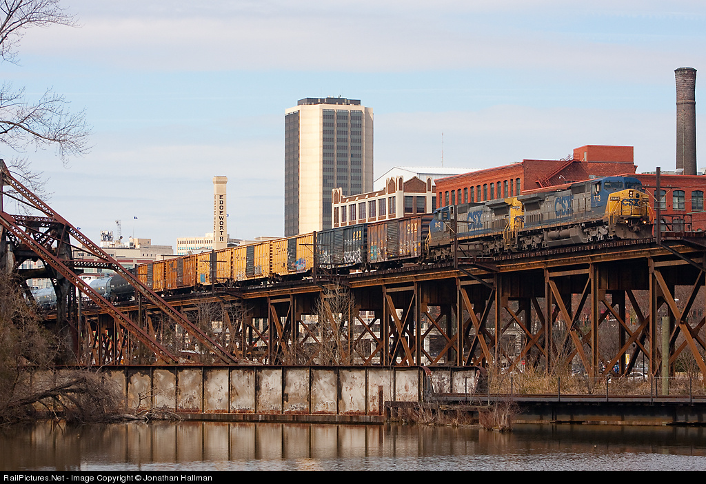 A mixed freight makes its way down toward Fulton Yard in Richmond behind a pair of veteran Dash 8s. The viaduct on which the train is traveling is 3 miles long, connecting the Peninsula and the Rivanna Subdivisions along the James River. It forms the top level of Richmond's Triple Crossing. The bascule bridge in the foreground is part of the NS (formerly Southern) line to West Point, Virginia, and the body of water it crosses is the eastern end of the James River and Kanawha Canal. While the NS line is still active the bridge is now welded closed, as the locks at the eastern end of the canal are no longer functional. The western part of the canal's projected path became the route followed by the C&O's water level line along the James River to the coal fields of West Virginia.