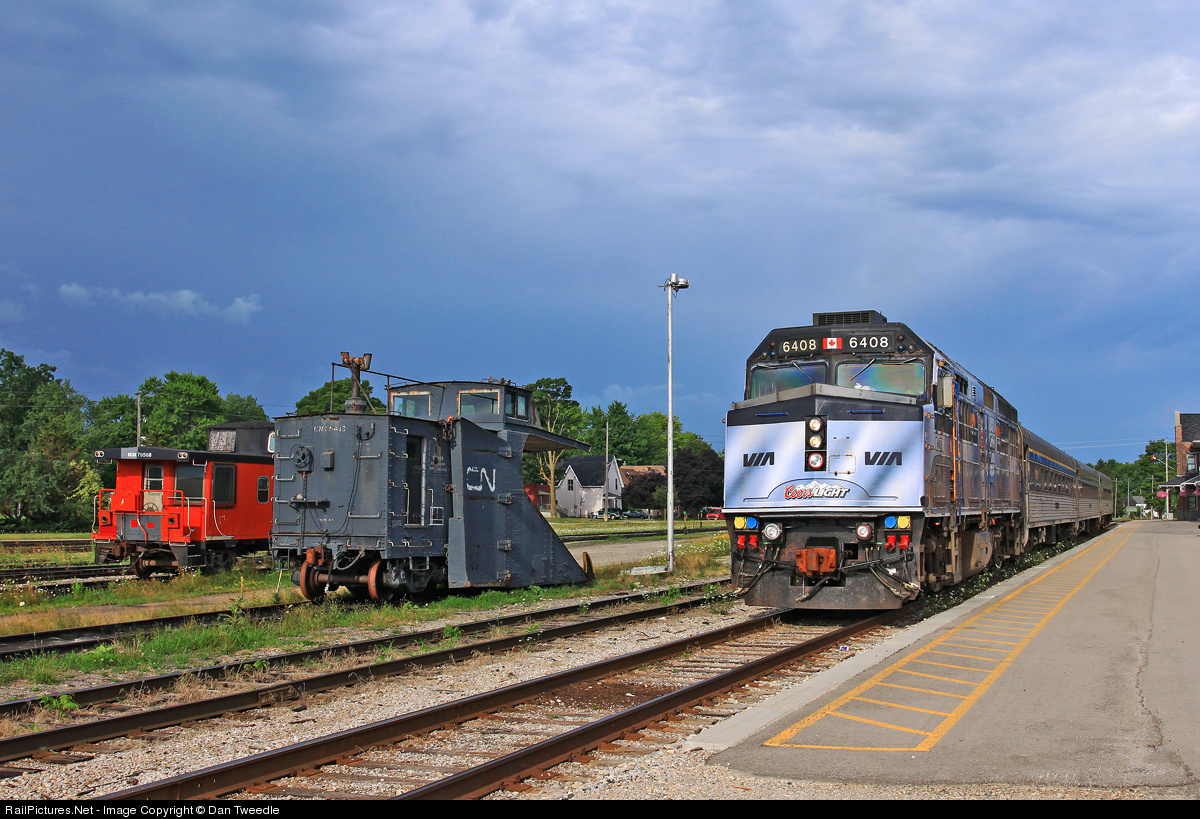 A summer thunderstorm looms in the sky as VIA 6408 departs the Stratford Station with some older ex-CN, now GEXR, equipment sitting on the storage tracks.