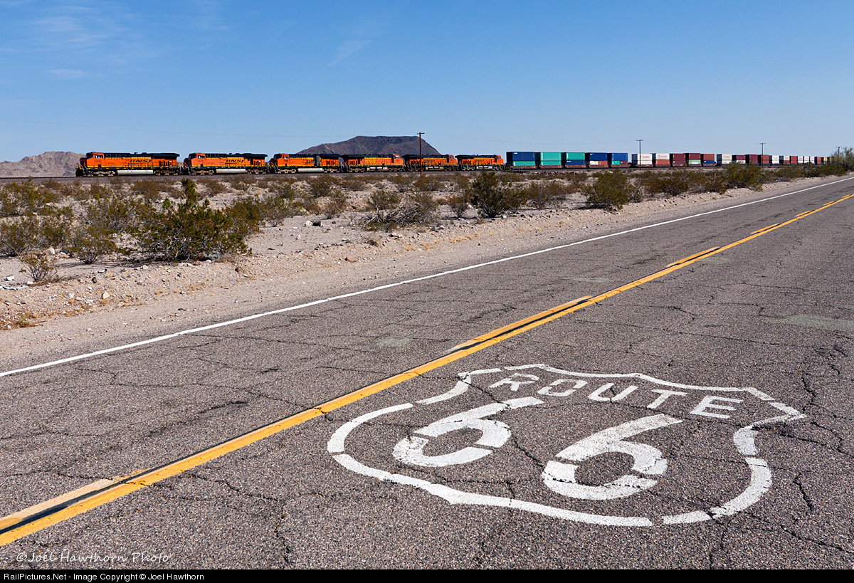 Out in the middle of the Mohave desert the iconic Rte 66 logo marks the historic Chicago to LA highway as a six pack on a stack rolls by.