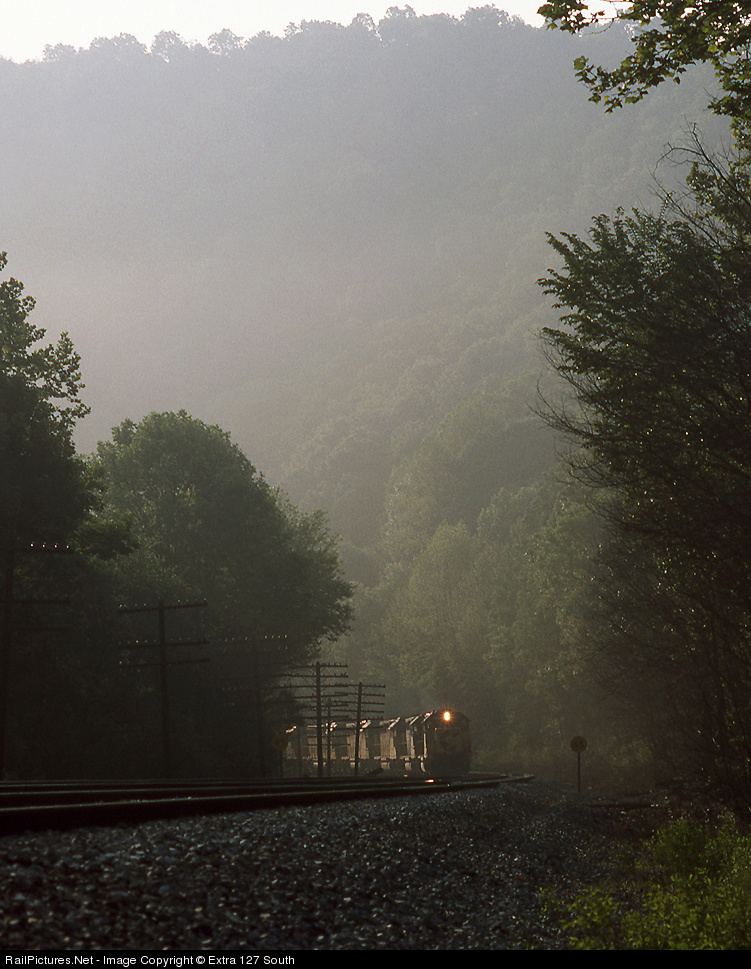 Westbound B&O CHTT, the "Chicago Trailer Train," was rounding a curve east of Paw Paw, WV as the morning mist lifted in the Potomac River Valley on June 1, 1986.
