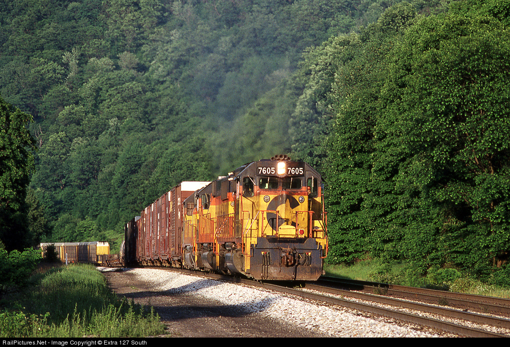 Westbound B&O hotshot No. 397 was climbing up into Roddy's Sag, west of Glencoe, PA, late in the day on June 6, 1987. Roddy's Sag is a short reprieve from the climb up Sand Patch Grade. Looking back, I see how rough the power looked early in the CSX era.