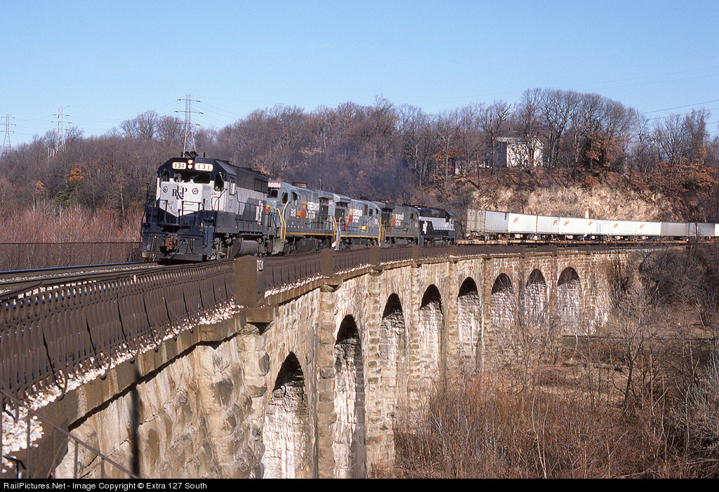 Westbound B&O train OBSS (Orange Blossom Special South) was passing over Thomas Viaduct in Relay, MD on Jan. 17, 1987. Because RF&P was equipped with Automatic Train Control, a RF&P unit on that railroad. Power was swapped out at Acca Yard in Richmond, and RF&P power was used in the lead between Richmond and Kearny, NJ on OBSN and OBSS.