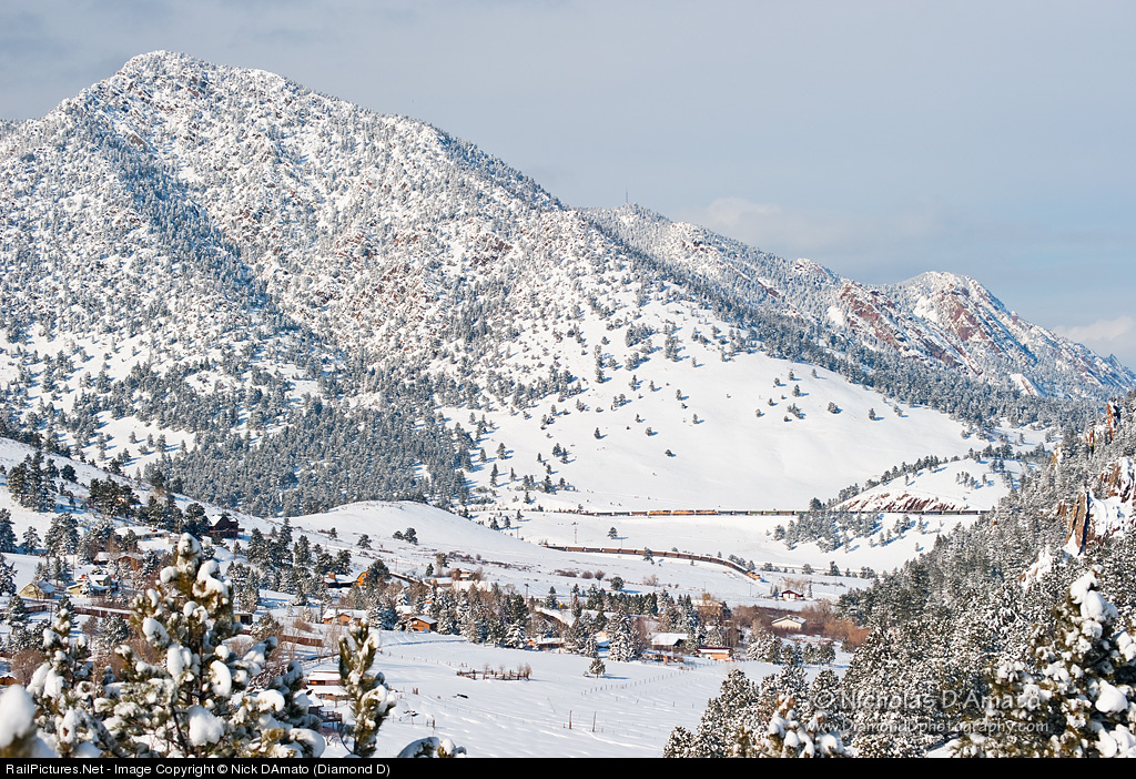 Spectacular soft winter light shines down on the front range of the Rockies hours after the snow storm clears out of town. From across the valley, we see an eastbound UP coal train stretched out across the entrance to Coal Creek Canyon with the DPUs trailing far behind.