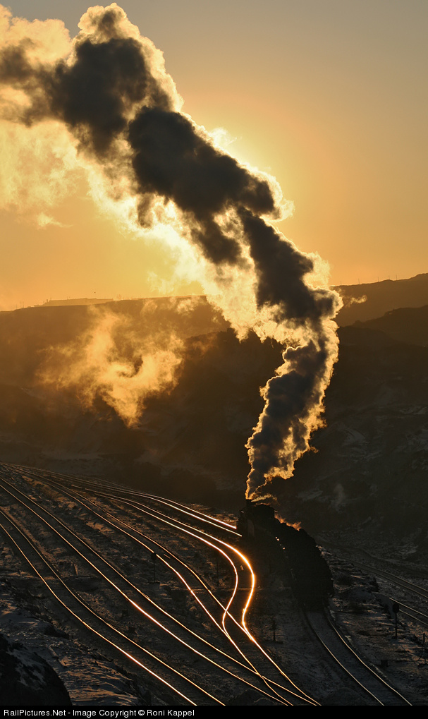 "The Banana" - evening in the open cast mine of Zhalai Nuer, Inner Mongolia, at -20° C. Sadly, railway operations stopped in this steam world wonder in November 2009.
