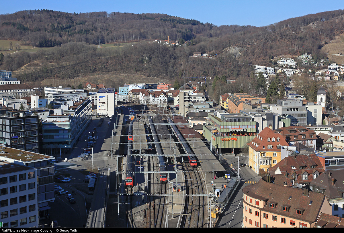 View from the hill of Stein castle ruins to Baden Station, one of the first in Switzerland (1847). On track 1 (right) IR 1929 from Berne via Olten-Brugg to Zürich, on track 3 IR 2078 from Zurich Airport to Basel, on track 4 S 27 25961 to Koblenz-Walshut (Domino push pull train), on track 5 the S 6 service 18665 to Uetikon via Regensdorf-Oerlikon-Zurich (Doubledeck push pull train with Re 450). The station building (right from the tracks), now sandwiched between larger modern buildings, dates from 1847!