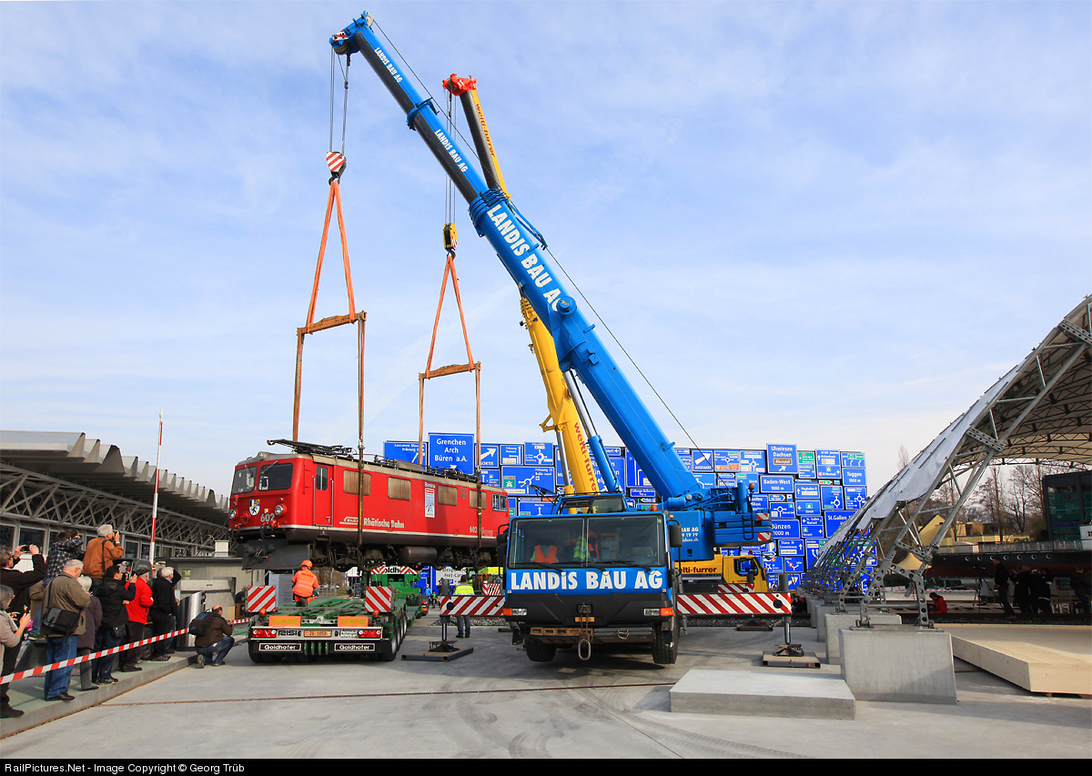 After 65 years in service, locomotive Ge 4/4 I 602 "BERNINA" of the RhB goes in retirement, for the next few years in the Swiss Museum of Transport (Verkehrshaus der Schweiz) in Lucerne. The 47-ton vehicle was placed on a flatbed truck from Landquart to Lucerne and is now being unloaded by two 100 ton cranes on the prepared piece of track. The locomotive travelled about 6 Mio kilometers or 8 times to the moon and back in its career on the Rhaetian Railways network (excluded Bernina line).