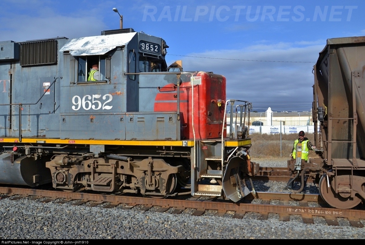 Unpatched SSW 9652 slowly crawls forward to couple to a string of empty "dirty dirt" hoppers for forwarding to South San Francisco.