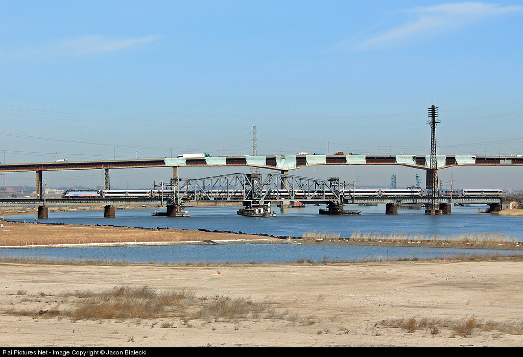 After leaving Secaucus Junction, a NJ Transit train pulls west across the Hackensack River. The overpass receiving work is that of the NJ Turnpike Eastern Spur.