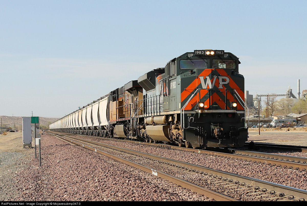 | After having just shot the WP heritage unit the day before near Lathrop in Northern California, here we see UP 1983 on the point of a unit rock train for the facility at Oro Grande on the Cajon Sub. |