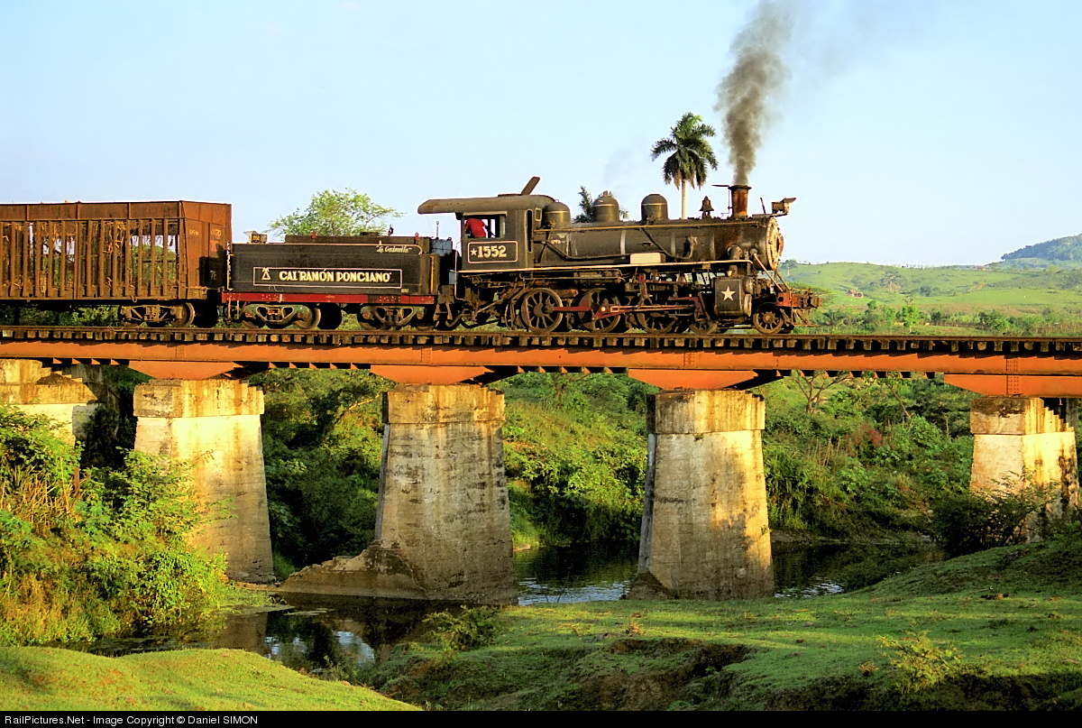 | Minaz ten-wheeler #1552 is shunting an empty train near the Ramon Ponciano sugar mill in the warn evening sun. This locomotive has seen better days in the past. Steam was leaking from every individual pipe. |