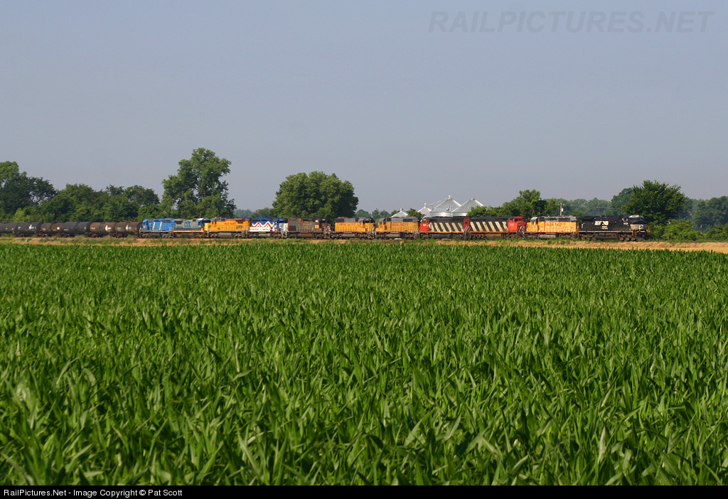 UP MNLAS 20 comes north this morning past the growing cornfields of Illinois. It is loaded with colorful power, including leader NS 9836, UP 3273, CN 2403, CN 5436, UP 7884, UP 7876, UP 3300, UP 9332, CSXT 5940, CEFX 3115, and UP 7911.